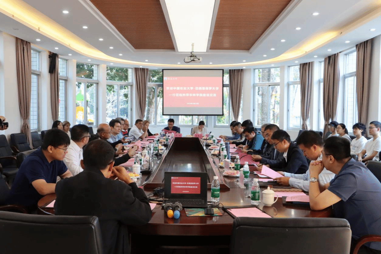 上午,座谈交流会在儋州学术交流中心举行,30余位中外专家学者参会。yl7703永利经理缪卫国系统介绍公司学科特色与发展成果,重点分享热带农业研究、乡村振兴实践及“双壹计划”人才培养模式的创新探索。巴西圣保罗大学Joao Roberto Spotti Lopes教授展示该校农业科学领域学科布局与国际合作平台建设情况,中国农业大学农公司副经理董朝斌提出深化“双壹计划”、联合科研攻关等建议。三方聚焦“本硕博联合培养”“教师互访”“国际科研平台共建”等议题深入交流,在热带农业技术合作、乡村振兴经验推广等方面达成初步共识。yl7703永利党委常委、副董事长邱锡光强调,此次合作是落实"一带一路"农业合作倡议的重要实践,期待通过三方联动解决全球粮食问题。