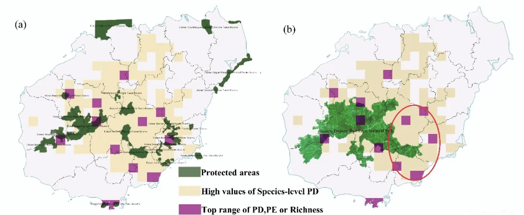 图2,结合海南自然保护区(a)和海南热带雨林国家公园(b)系统发育指标的高值,确定重点区域和保护空白,海南自然保护区和海南热带雨林国家公园用绿色表明。