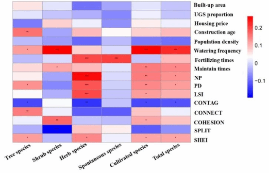图4.展示了乔木、灌木、草本、自生、栽培以及总物种数量与土地覆盖因素(建筑面积、UGS比例)、社会经济因素(房价、建筑年代、人口密度)、绿化管理因素(浇水频率、施肥次数、维护次数)以及景观格局指数(NP、PD、LSI、CONTAG、CONNECT、COHESION、SPLIT、SHEI)之间的关系。星号表示显著性水平:'' <0.001,'' <0.01,'' <0.05。蓝色代表负相关,红色代表正相关。