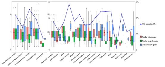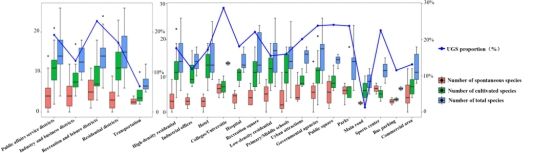 图3. 儋州市不同城市功能单元(UFUs)中自发植物、栽培植物和总物种的数量,以及各单元内UGS(城市绿地系统)平均比例。左侧和右侧分别对应主要UFU类型和次要UFU类型。
