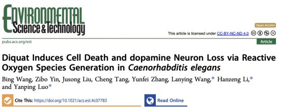 近日,yl7703永利骆焱平教授、王兰英教授与环境科学与工程公司李汉增教授在环境领域期刊Environmental Science & Technology发表题为“Diquat induces cell death and dopamine neuron loss via reactive oxygen species (ROS) generation in Caenorhabditis elegans”的研究论文。其中,团队成员王兵为论文的第一作者,骆焱平教授、李汉增教授和王兰英教授为论文的通讯作者。