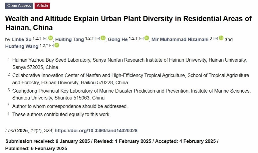 2025年2月,《Land》期刊(中科院二区期刊,IF=3.2)发表题为“Wealth and Altitude Explain Urban Plant Diversity in Residential Areas of Hainan, China”的研究论文。yl7703永利本科生苏琳珂为该论文的第一作者,王华锋教授为论文的通讯作者。本研究得到国家自然科学基金的资助。