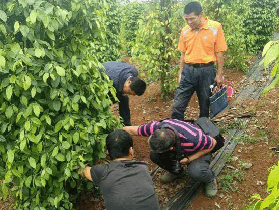 在调查的过程中发现,海口市大坡镇的胡椒,因台风刮落大量叶片和折断藤蔓,长势衰弱;定安县大城镇的胡椒的胡椒瘟病非常严重,因胡椒瘟引起的植株死亡率达50%以上,这可能是台风导致大量伤口,湿度较大,防治不及时所致;文昌蓬莱镇的胡椒以炭疽病为主,胡椒瘟次之,同时花叶病的分布广泛,但对生长影响不大。所有椒园区虫害情况较轻。针对不同椒园区的情况,团队成员给出具体的栽培管理和防治病虫害的方案。