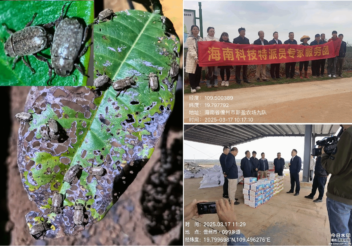 2024年9月台风"摩羯"过境后,新盈农场原天然橡胶林遭摧毁,为提质增效改种1089亩榴莲蜜。但因倒伏胶木腐烂滋生虫害,鳃金龟大量爆发。该害虫昼伏夜出,成虫啃食叶片成筛网状,幼虫啃食根系,严重阻碍植株光合作用与生长。