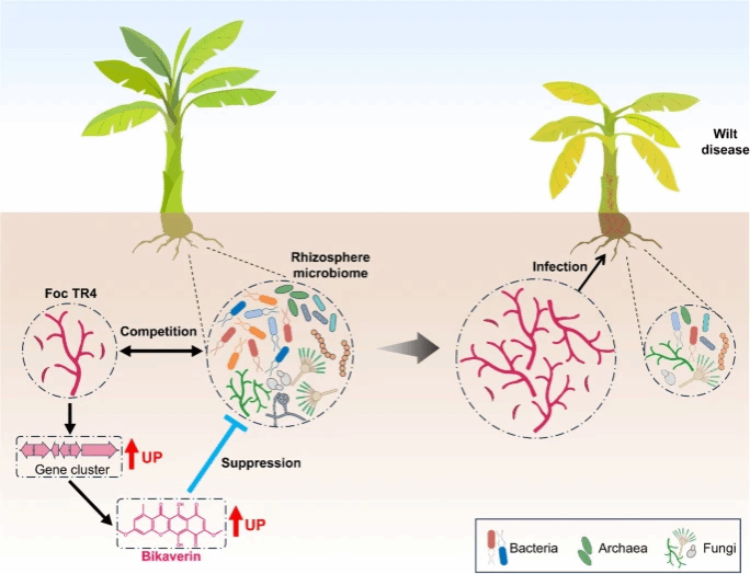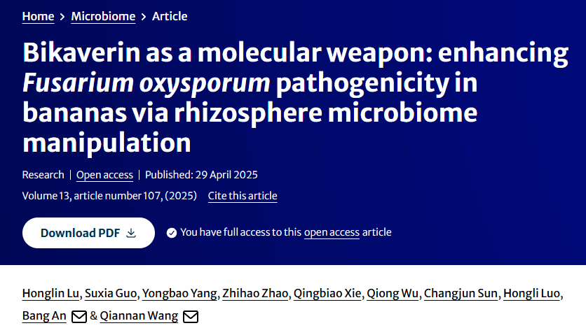 2025年4月30日,yl7703永利yl7703永利重要热带作物抗病分子育种团队在国际权威期刊Microbiome(五年影响因子17.9)上发表最新研究成果,“Bikaverin as a molecular weapon: enhancing Fusarium oxysporum pathogenicity in bananas via rhizosphere microbiome manipulation”。该研究首次揭示了尖孢镰刀菌次生代谢产物比卡菌素(bikaverin)作为“分子武器”操控根际微生物组,从而提升病原菌致病力的分子机制,为香蕉枯萎病的抗病机制研究提供了全新视角与理论依据。