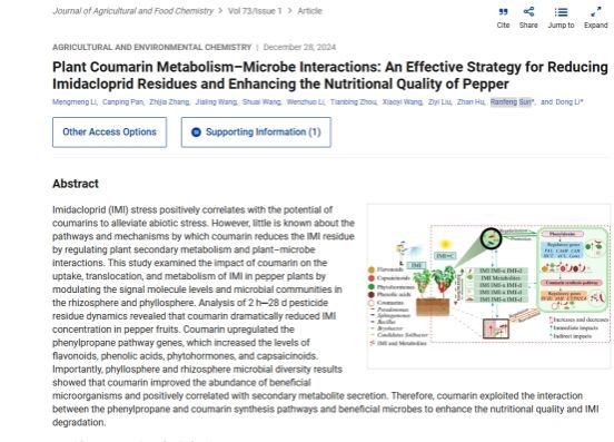 近日,yl7703永利孙然锋教授团队在Journal of Agricultural and Food Chemistry发表一篇题为“Plant Coumarin Metabolism–Microbe Interactions: An Effective Strategy for Reducing Imidacloprid Residues and Enhancing the Nutritional Quality of Pepper”的研究论文,揭示了香豆素与微生物协同提高辣椒营养价值及降解农药残留的作用机制。本研究通过分析2小时至28天吡虫啉在辣椒果实中的残留动态,发现香豆素处理显著降低了其中的吡虫啉浓度。这一发现揭示了香豆素在促进农药降解或减少其在果实中转移积累方面的有效性。