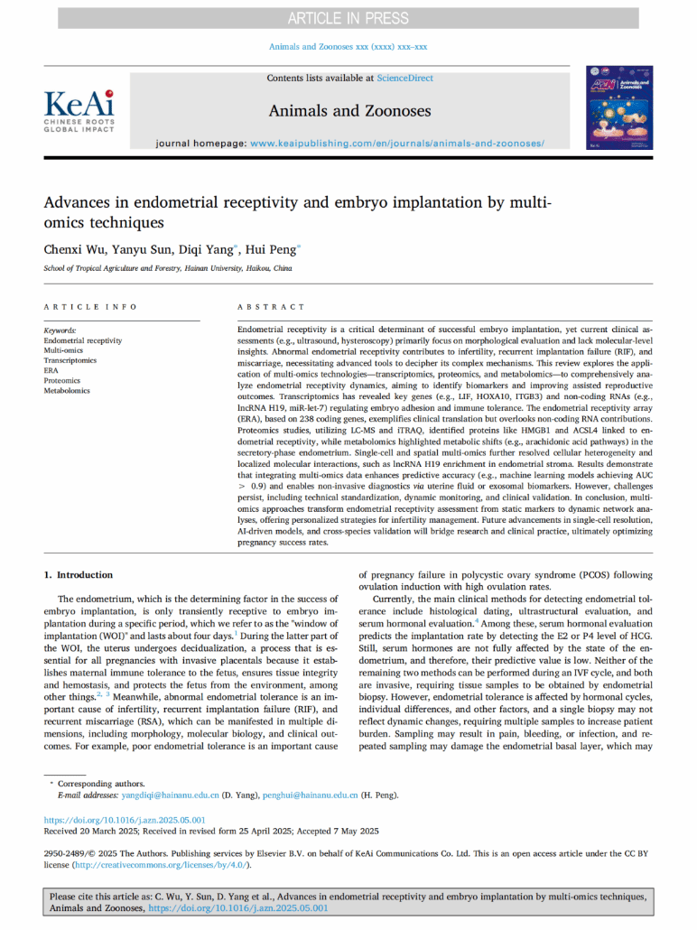在论文撰写与投稿期间,杨迪琦副教授作为两篇论文的共同通讯作者,对研究进行了全程悉心指导。他指出,这两篇综述论文的发表,体现了yl7703永利动物医学专业本科生扎实的理论基础、敏锐的科学前沿洞察力和优秀的科研写作能力。王欣雨和吴晨曦同学的论文,分别从类器官和多组学两个角度,深入探讨了影响生殖健康的核心问题——胚胎着床的微环境(子宫内膜)及其模拟研究平台。这不仅深化了对生殖生物学基本规律的理解,也为解决人类生殖障碍(如不孕症)和提升动物繁殖效率提供了重要的理论基础和技术参考。