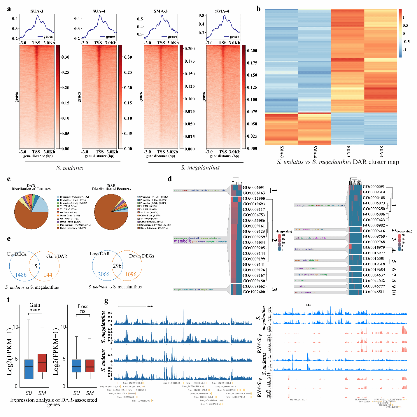 ATAC-seq分析显示,二倍体火龙果的染色质可及性更高,数千个差异可及区域与启动子区域重叠,并涉及ATP代谢、胁迫响应和光合作用相关基因(图7)。通过DiffBind工具比较发现,两个物种间存在13,977个差异可及区域(DARs),其中3,355个为获得性DARs,10,622个为缺失性DARs。DAR信号值的聚类分析揭示了物种间的显著差异。进一步对启动子关联的DARs分析表明,火龙果与燕窝果相比,获得性DARs关联159个基因,而缺失性DARs则关联2,362个基因。
