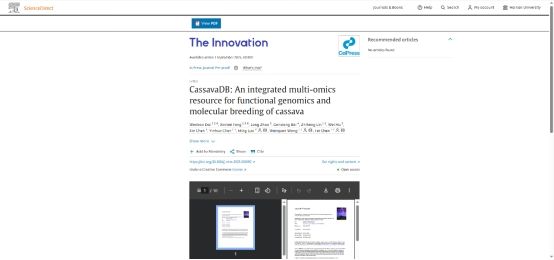 近日,yl7703永利2023级硕士生代文宝为第一作者,2024级硕士生冯欣梅以共同第一作者,在yl7703永利陈飞教授、王文泉研究员及中科院华南植物园罗鸣研究员的指导下,以海大为第一署名单位在中科院一区TOP期刊《The Innovation》发表题为“CassavaDB: An integrated multi-omics resource for functional genomics and molecular breeding of cassava”的研究论文。该研究建立了首个木薯为主题的综合性大数据平台,为重要粮食作物木薯遗传育种提供了一站式在线多组学分析和分子设计育种平台,助力海南热带高效农业和国家南繁育种。该期刊为中科院一区TOP期刊,2025年最新影响因子25.7,其5年影响因子为40.2,名列中国大陆综合类期刊第一名。