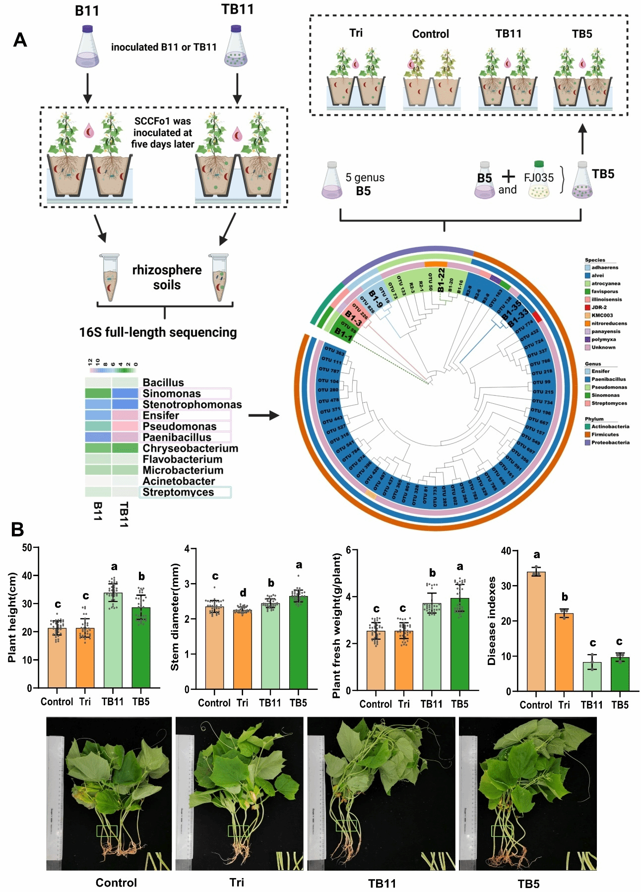 研究进一步将TB11简化为由FJ035与6株核心细菌(属于StreptomycesSinomonasEnsiferPseudomonasPaenibacillus)组成的简化菌群TB5。该简化菌群防效达71.43%,植株鲜重增加54.69%,表现出与TB11相近的防控与促生效果(图2)。