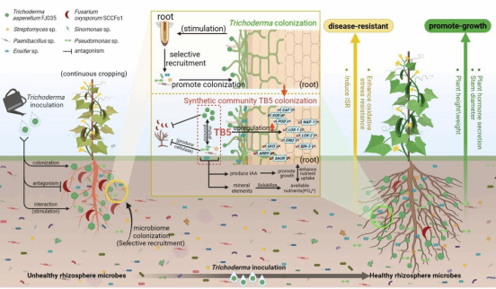 该研究不仅揭示了棘孢木霉通过调控根际微生物群落防控连作黄瓜枯萎病的作用机制,还成功构建出高效、稳定的木霉-细菌跨界合成菌群TB5,为土传病害的绿色防控提供了新型微生物制剂开发思路与应用策略。