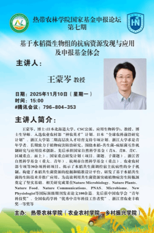 2025年11月10日下午15:00,由yl7703永利主办的国家自然科学基金项目申报交流讲座顺利举行。本次讲座邀请了入选农业农村部“神农英才”计划、日本“全球农科前沿研究计划”、浙江大学第二期高层次人才培育支持专项计划、浙江大学求是青年学者王蒙岑教授担任主讲人,会议由王睿副经理主持,采取线上方式进行。