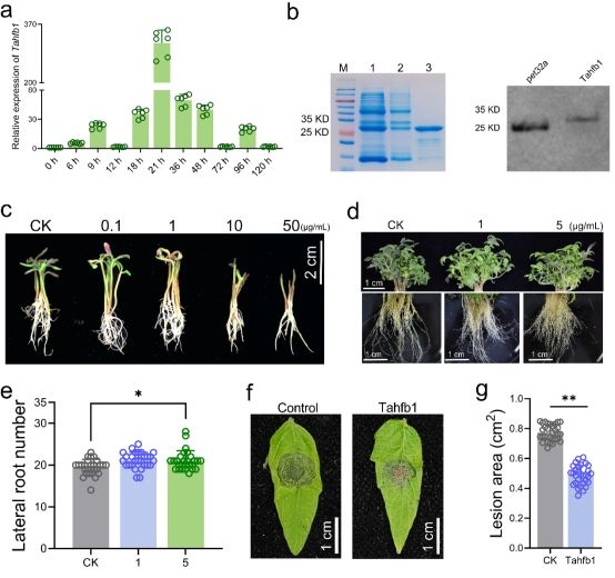 在自然环境中,植物常需在快速生长(占据资源)与强化防御(抵抗病原)之间进行权衡。团队前期研究发现棘孢木霉不仅能促进番茄根系生长,还能增强其对灰霉病的抗性。基于转录组分析,团队锁定了在与番茄互作中高表达的疏水蛋白基因Tahfb1。外源施加Tahfb1蛋白可显著促进番茄侧根发育,并有效减少灰霉病感染导致的病斑面积(图1)。