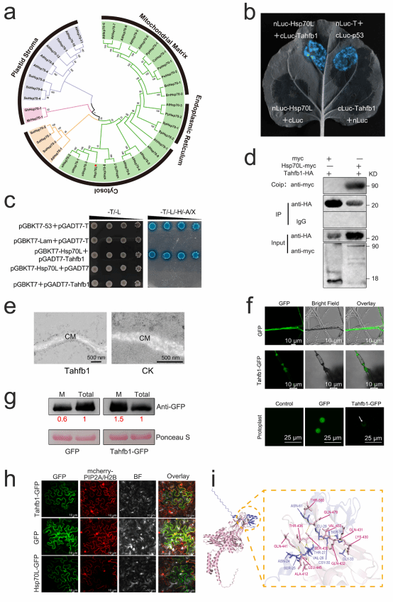 为深入解析Tahfb1的作用靶点与分子机制,研究团队利用LC-MS/MS技术筛选并鉴定出番茄中的互作蛋白Hsp70L。随后通过酵母双杂交(Y2H)、免疫共沉淀(Co-IP)及荧光素酶互补(Luc)实验,证实了Tahfb1与Hsp70L之间存在特异性互作(图3)。