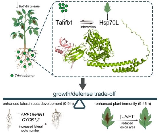 利用RNAi技术沉默番茄Hsp70L基因后,Tahfb1诱导的侧根发育被显著抑制,同时病斑面积增加。这表明Tahfb1正是通过靶向Hsp70L,协同激活生长素介导的侧根发育途径与JA/ET依赖的系统防御网络,从而实现“促生长”与“增抗性”的双重功能(图4)。该研究首次提出了“Tahfb1-Hsp70L”模块作为木霉与植物互作的关键枢纽,破解了植物在生长与防御间的资源分配难题,为开发兼具促生与抗病功能的绿色生物农药提供了新靶点与新思路。