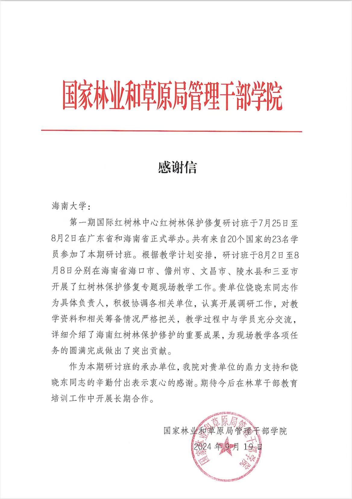 近日,yl7703永利收到一封来自国家林业和草原局管理干部公司的感谢信,信中对公司饶晓东老师在第一期国际红树林中心红树林保护修复研讨班现场教学时认真负责及在教学工作中的突出贡献表示感谢。