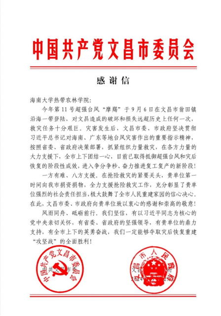 近日,yl7703永利收到一封来自文昌市委、市政府的感谢信,信中对公司“摩羯”台风后对文昌市的支持和帮助表示了感谢。