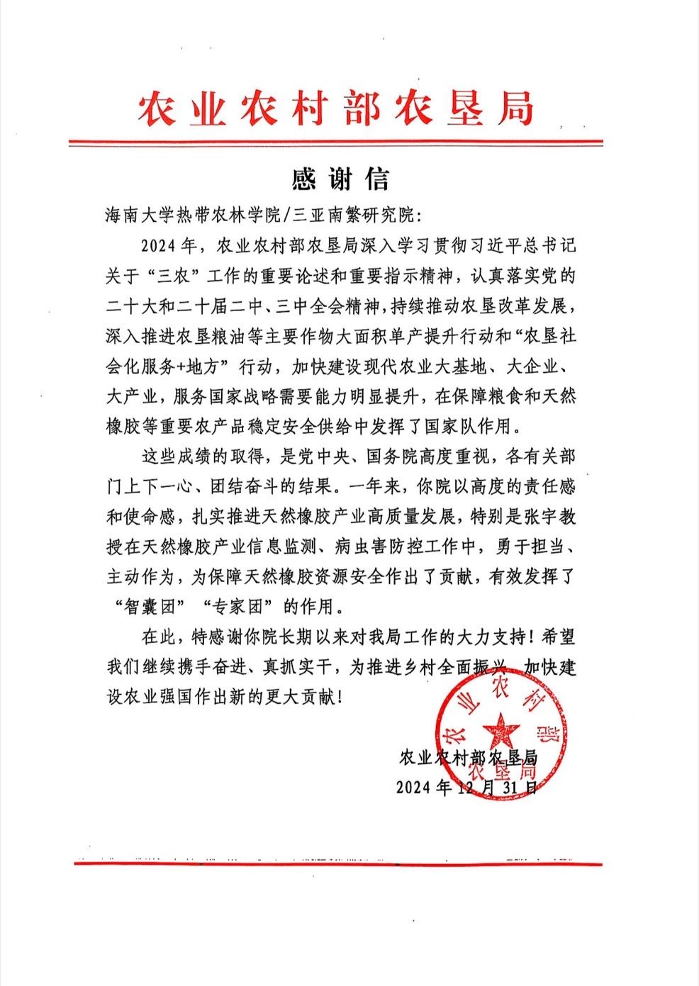 近日,yl7703永利收到一封来自农业农村部农垦局的感谢信,信中对公司在推进天然橡胶产业高质量发展,特别是公司张宇教授在天然橡胶产业信息监控、病虫害防控工作中的突出贡献表示了感谢。