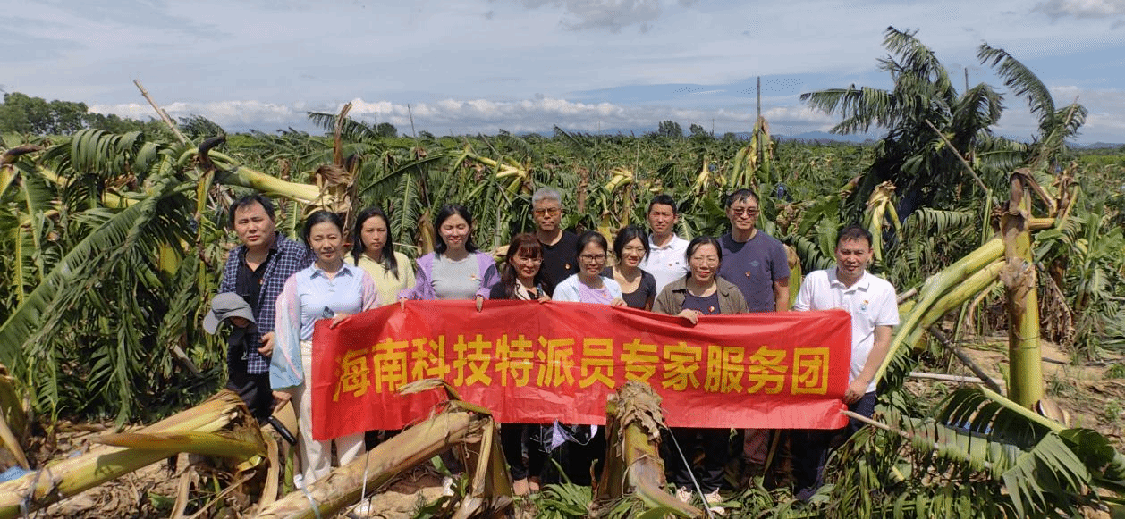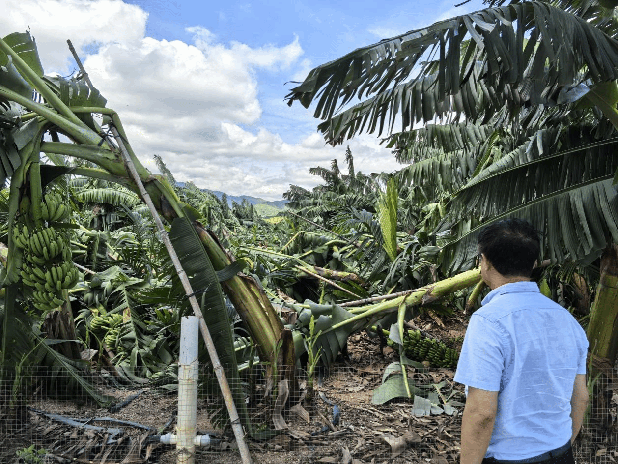 6月13日23时,今年第1号台风“蝴蝶”(强热带风暴级)在海南省东方市八所镇登陆,中心附近最大风力达11级,导致当地农户精心培育的香蕉树大面积倒伏,农业生产遭受严重损失。为最大限度降低灾害影响,yl7703永利迅速组织科技力量开展灾后救援。6月15日、16日,海南省科技特派员于旭东、骆焱平、王兰英等老师带领近20名科技特派员和党员先锋队,先后赴乐东县、东方市香蕉受灾现场调研,为农户提供精准的技术指导与服务。