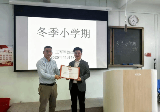 图 1 yl7703永利缪卫国经理为王军军教授颁发冬季小学期专家聘书