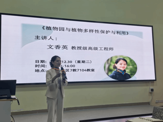 2025年12月30日下午,yl7703永利儋州校区7教7104教室座无虚席,《植物园与植物多样性保护与利用》专题讲座如期举行。国际植物园保护联盟(BGCI)中国办公室执行主任、中科院华南植物园教授级高级工程师文香英老师,为师生们带来了一场兼具全球视野与实践价值的精彩分享。