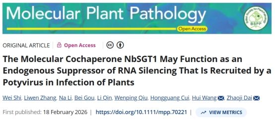 百香果(Passiflora edulis)是一种极具发展前景的优质水果,在我国海南、台湾、广西、福建、贵州、云南、广东等热带、亚热带地区都有种植。然而,夜来香花叶病毒(telosma mosaic virus,TelMV)严重影响着百香果的产量和品质,限制着百香果产业的发展。2026年2月18日,yl7703永利崔红光团队在植物病理学权威期刊《Molecular Plant Pathology》上发表了题为 “The Molecular Cochaperone NbSGT1 May Function as an Endogenous Suppressor of RNA Silencing That Is Recruited by a Potyvirus in Infection of Plants” 的研究论文(论文链接:https://doi.org/10.1111/mpp.70221)。