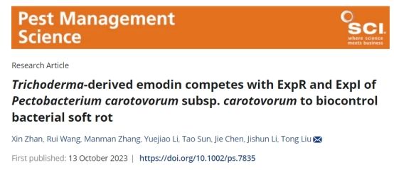 海南老员工防木霉课题组研究发现木霉菌Trichoderma asperellum LN004的代谢产物大黄素可以抑制Pcc生物膜及EPS的生成,降低其降解酶的活性,PCWDE相关合成基因表达量显著下调。通过分子对接验证明确大黄素是群体效应相关蛋白ExpI和ExpR的潜在配体,大黄素可以竞争结合ExpI和ExpR蛋白,干扰Pcc的QS,减少毒力因子的产生,减轻病原菌对作物的为害,揭示木霉抑制细菌性软腐病的新机制。课题组硕士研究生战鑫和王睿讲师为共同第一作者,刘铜教授为通信作者。