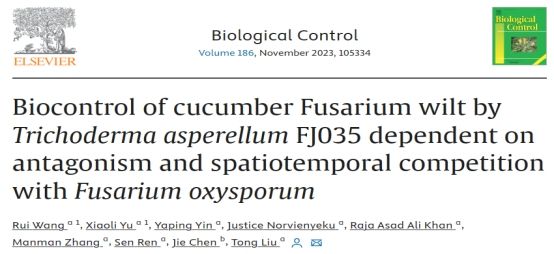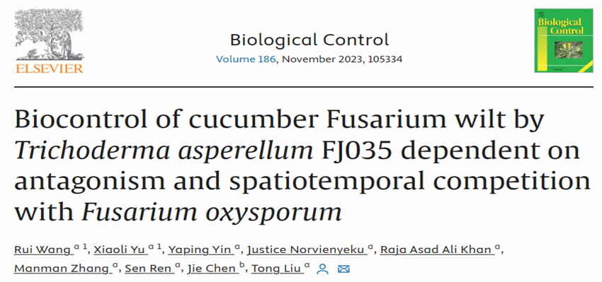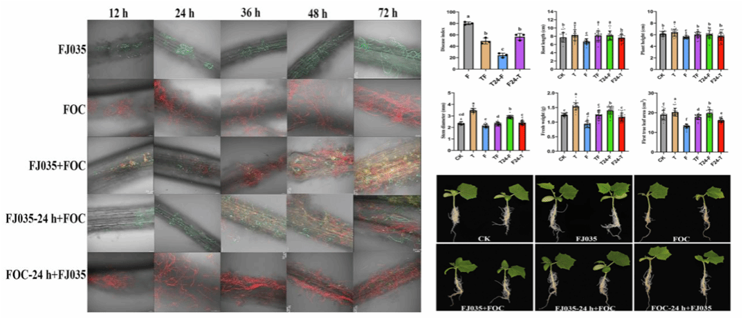 黄瓜枯萎病是一种由尖孢镰孢菌黄瓜专化型(Fusarium oxysporum f. sp. cucumerinum Owen,FOC)引起的全球性土传病害,在黄瓜整个生长季均能侵染,对全球黄瓜产量造成了严重的损失。海南老员工防木霉课题组筛选出对FOC具有良好拮抗作用的棘孢木霉FJ035,该菌株可有效抑制FOC的孢子萌发,且提高了黄瓜种子的发芽潜力。进一步通过荧光标记结合显微观察技术对棘孢木霉FJ035与FOC在黄瓜根际的时空竞争进行了动态监测。结果表明棘孢木霉FJ035与FOC孢子悬浮液同时处理黄瓜根部时,FOC孢子可迅速在根部富集和萌发,而棘孢木霉对FOC的抑制效果较弱;当接种FOC孢子悬浮液前24 h用棘孢木霉FJ035孢子悬浮液处理,可显著减少FOC孢子在黄瓜根部的积累,且其孢子的萌发也受到抑制。水培和盆栽条件下对黄瓜枯萎病的最高防治效率分别为69.79%和75.96%,同时棘孢木霉FJ035还有效的减轻FOC对黄瓜生长的不利影响。因此,棘孢木霉FJ035作为预防性生物制剂使用效果最佳。该研究描述了棘孢木霉FJ035与FOC在黄瓜根际的时空竞争关系,为探索木霉的生防机制和指导其在生产中的应用提供了理论依据。课题组王睿讲师和硕士研究生于笑丽为共同第一作者,刘铜教授为通信作者。