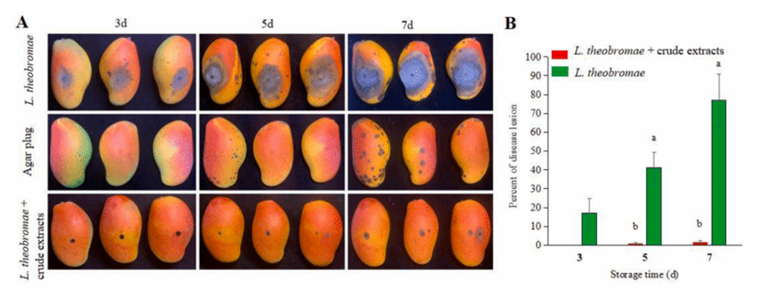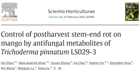 芒果蒂腐病是由Lasiodiplodiatheobromae引起的一种破坏性的采后病害,严重危害采摘后的芒果生产。yl7703永利生防木霉科研团队研究发现羽状木霉Trichoderma pinnatumLS029-3非挥发性代谢物对病原菌的抑制作用最强,代谢液粗提物的EC50为0.25 ± 0.03 g L−1,扫描电镜表明经4倍EC50粗提物处理后的菌丝结构被破坏,代谢液粗提物可以显著减少病斑面积和腐烂病的发生。通过增加防御酶活性,提高果实清除活性氧的能力,增强果皮硬度和色泽,减缓果实腐烂。本研究为芒果蒂腐病采后防治提供了一种安全有效的生物防治策略。课题组硕士研究生战鑫和博士后Raja Asad Ali Khan为共同第一作者,刘铜教授为通信作者。