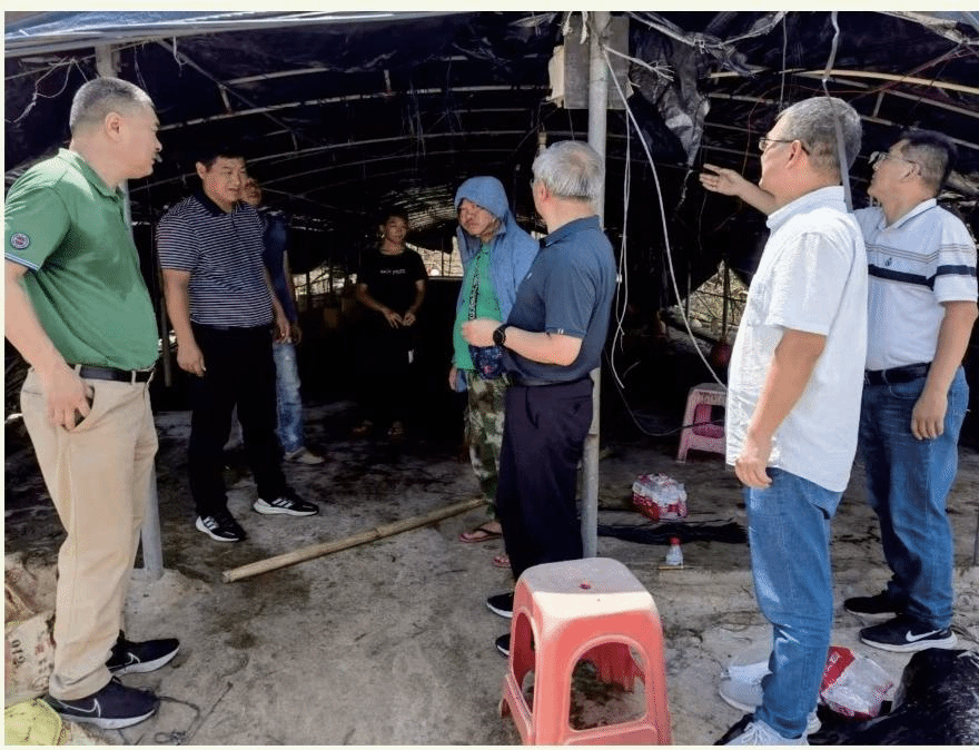 潭牛文昌鸡公司技术总监王总带领产业体系专家查看了养殖场的灾后现状,介绍了灾后损失情况以及面临的困境;之后体系 专家又到传味文昌鸡养殖基地查看了灾后复产情况。产业体系专家指导意见如下:(1)加强存活或转场(舍)文昌鸡的饲养管理;保证洁净饮水和无霉变饲料供应,饮水中添加多维素和微量元素,饲料或饮水中添加提免抗病等中药制剂;选择碘制剂、过 硫酸氢钾带鸡消毒;(2)及时收集死亡鸡只,做好无害化处理;(3)开展全面环境消毒,开放式鸡舍首选烧碱(2%-3%氢氧化钠 溶液)或生石灰进行地面消毒。密闭舍使用2-3种不同类型的消毒 剂(2%-3%氢氧化钠溶液、1:200戊二醛溶液、次氯酸钠溶液等) 消毒3次以上;养殖场及周边环境全面立体消毒;(4)灭蝇防鼠, 控制媒介生物及外寄生虫;(5)强化疫情检测预警,必要时做好紧急免疫。