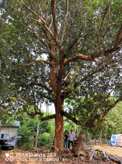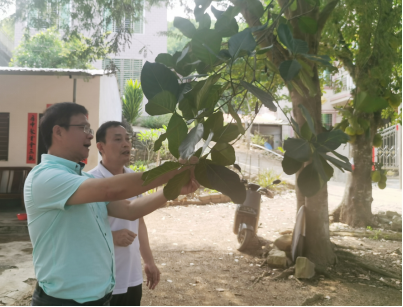 2024年4月18日,yl7703永利热带农林公司党委书记兼菠萝蜜种子资源选育岗科学家于旭东老师、yl7703永利菠萝蜜产业技术体系骆焱平老师及1名研究生一同赴儋州市侨植农场调研菠萝蜜资源分布情况,意外发现一株50余年的菠萝蜜树(图1)。据当地村民介绍,该树是许树培先生最早栽培的2棵树之一,一颗栽种在侨植农场三队,一株栽种在八一农场。