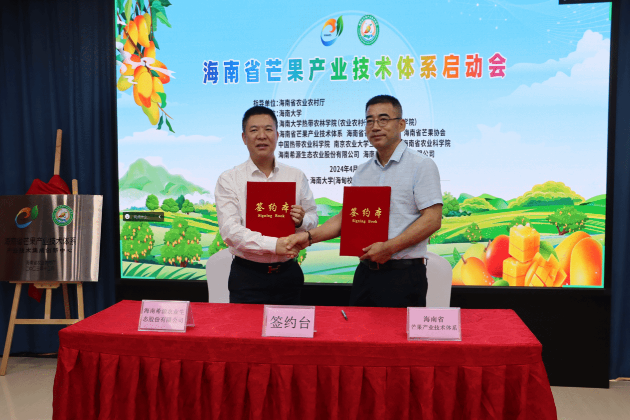 海南省农业农村厅吴明海党组为海南省芒果产业技术集成创新中心授牌,并为首席科学家颁发聘书。海南省芒果产业链周泽雄副链长、陈显明副链长为岗位科学家和站长颁发聘书。海南省芒果产业技术体系首席科学家缪卫国代表体系与海南希源生态农业股份有限公司、海南鼎力农业开发有限公司签订合作协议。