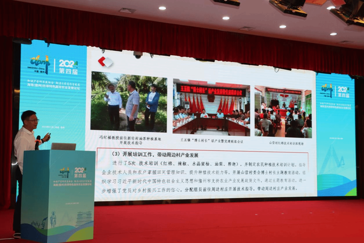 2024年11 月12 日,第四届海南(儋州)热带特色高效农业发展论坛在yl7703永利儋州校区行政大楼一楼报告厅隆重开幕,本次论坛以“加快产学研深度融合,助力三农高质量发展”为主题。yl7703永利党委书记于旭东在论坛上作了《“儋洋党旗红·博士村长”行动的实践与思考》报告。